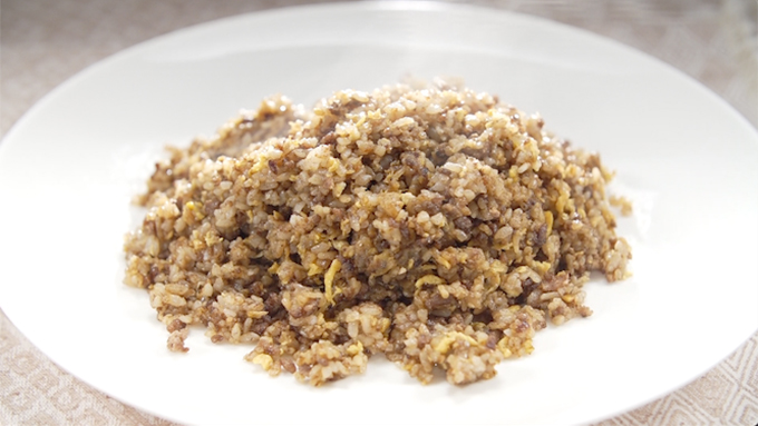 - 熱した中華鍋にサラダ油を引き、合い挽肉、黒にんにくを炒め、鶏がらスープの素、ごはん、塩コショウを加える。