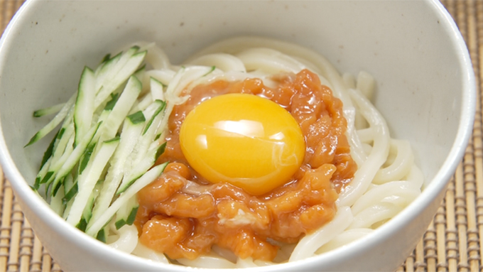 - お皿にうどん、サーモンユッケ、卵黄、きゅうりをのせ、しょう油を回しかける。