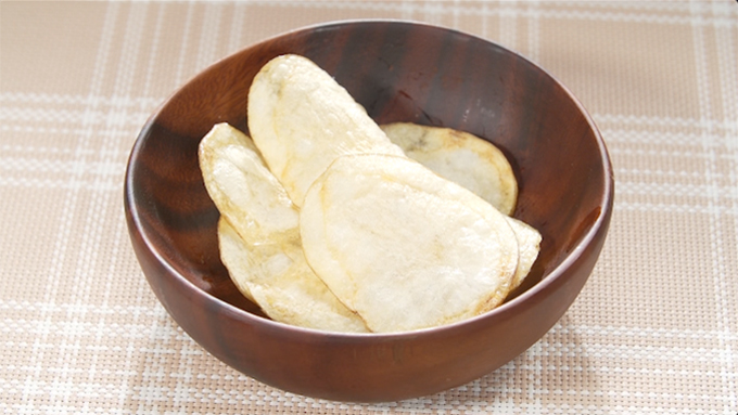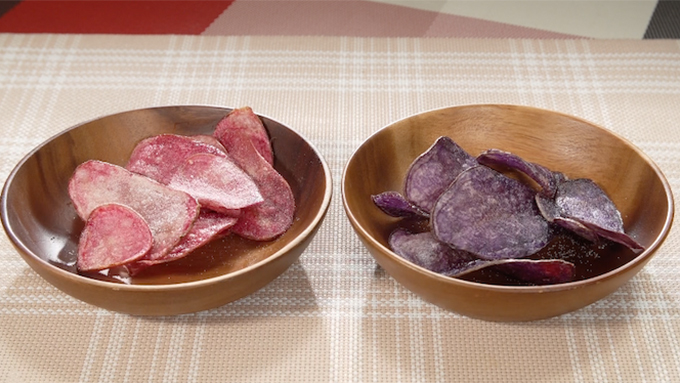ノーザンルビーは170℃で2分、シャドークイーンは170℃で2分半揚げる。 - 揚げたポテトチップスをお皿に盛り、お好みの味付けをする。