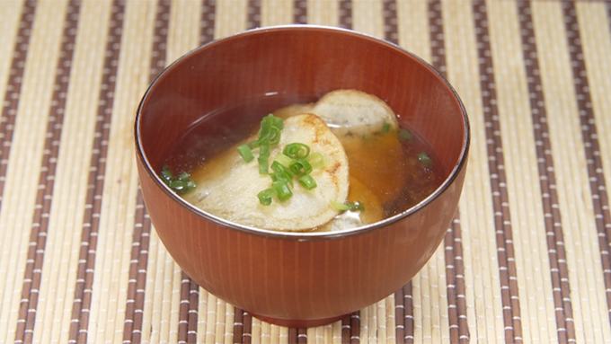- 沸騰したかつおだしに味噌を溶いてお椀に盛り、ポテトチップスを入れ青ネギを散らす。
