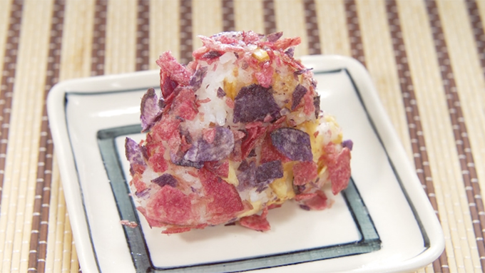 - 好きなポテトチップスを砕いておにぎりにまぶす。
