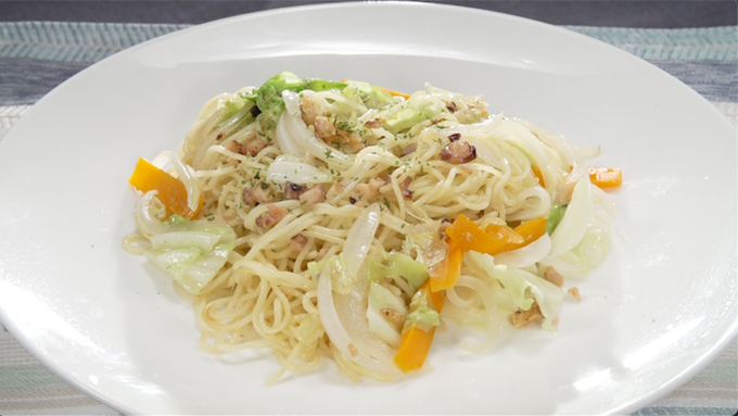 - 熱した鉄板に油を引き、にんじん、玉ねぎ、キャベツを中火で炒め、軽く火が通ったら、やみつきタコを加え、麺、水(分量外)、塩、コショウを入れて混ぜ合わせる。