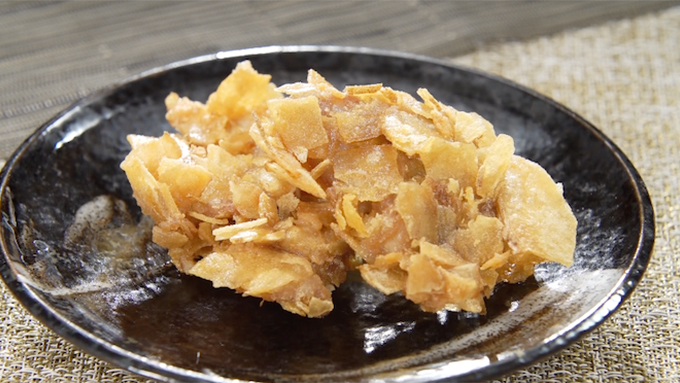 - 鶏肉に溶き卵、ポテトチップスを順にまぶし、180℃の油で5分揚げる。