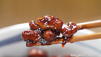 - 煮詰めていた味噌ダレの火を止め、素揚げした落花生を加え、絡める。