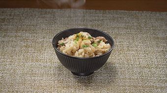 - お茶碗に盛り付け、青ネギをのせる。 ※ご家庭の炊飯器の取扱説明書をよく読み、調理を行ってください。