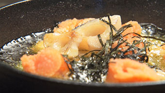 「れんこんと明太子のアヒージョ」