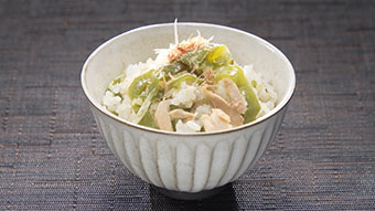 - 炊きあがったら、残りのゴマ油を入れて混ぜ、茶碗に盛り、かつお節をのせる。 ※ご家庭の炊飯器の取扱説明書をよく読み、調理を行ってください。