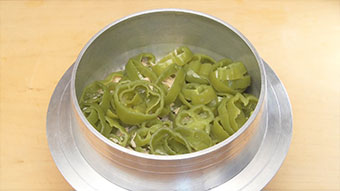 - ピーマンはヘタと種を取り、太めの輪切りにする。