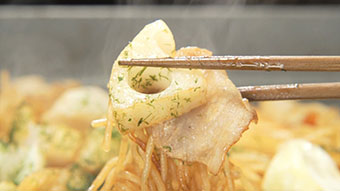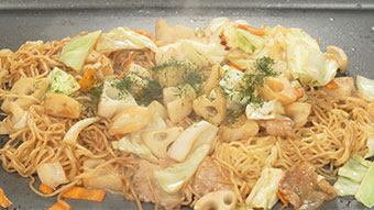 塩、こしょうを振り、色が変わる程度に炒めたられんこんを加える。 - れんこんに透明感が出てきたらにんじん、キャベツ、を加えてさらに炒め、麺と水を加えて炒め麺がほぐれたら、ソースを加えて全体を混ぜ合わせ、青のりを振る。