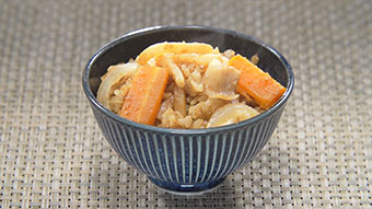 うどんは適当な大きさに切っておく。 - 炊飯器の釜に浸水して水気を切った米と水、顆粒だし、砂糖、薄口しょうゆ、カレー粉を入れて軽く混ぜ、豚肉、玉ねぎ、にんじん、うどんの順に入れ、最後にカレールウと氷を入れて炊く。 ※ご家庭の炊飯器の取扱説明書をよく読み、調理を行ってください。