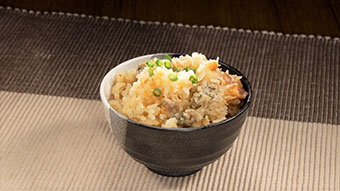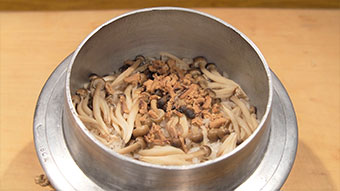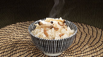 - 炊飯器に浸水した米、水、ニンニク、オリーブオイルを入れて混ぜ、ぶなしめじ、イカの塩辛、氷を加えて炊く。