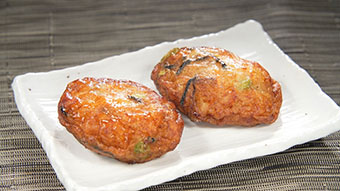 - さつま揚げのタネにニンジン、枝豆、ひじき、しいたけ、ごぼうを加えて混ぜる。