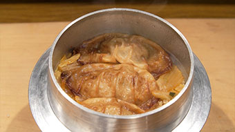 - 炊飯器に浸水した米、鶏がらスープ、ポン酢、キムチ、津ぎょうざ、氷を入れて炊く。