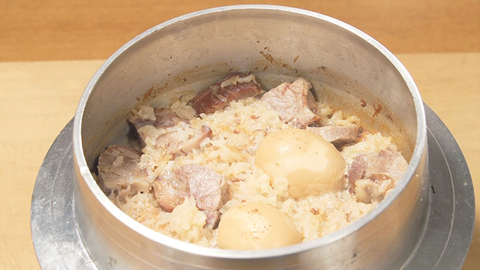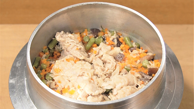 - 切り餅、しいたけ、にんじん、さやいんげん、下味をつけた豚肉、氷を入れて炊く。