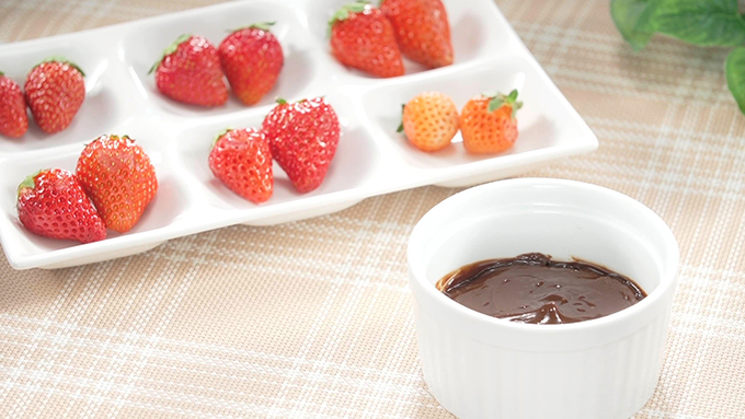 - イチゴから余分な水分が出ないように手でヘタをとり、竹串にイチゴを刺す。