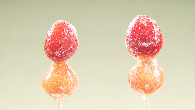 - 飴が150℃になったらイチゴに薄く絡ませ、飴が固まるまで冷ます。