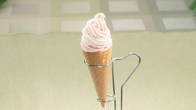 - 冷やしたソフトクリームを柔らかくなるまで手で揉みほぐし、口先を切り、口金をつけた絞り袋に重ねる。