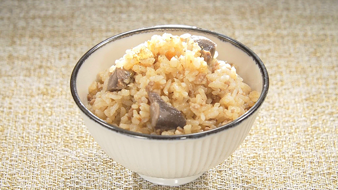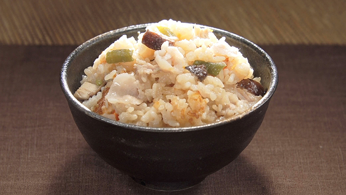 - 炊飯器の釜に浸水して水気を切った米、干ししいたけの戻し汁、鶏がらスープ、しょう油、酒、塩を入れ、混ぜる。