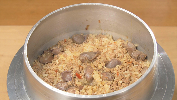 炒めた麻婆砂肝、氷を入れて炊く。 - ※ご家庭の炊飯器の取扱説明書をよく読み、調理を行ってください。