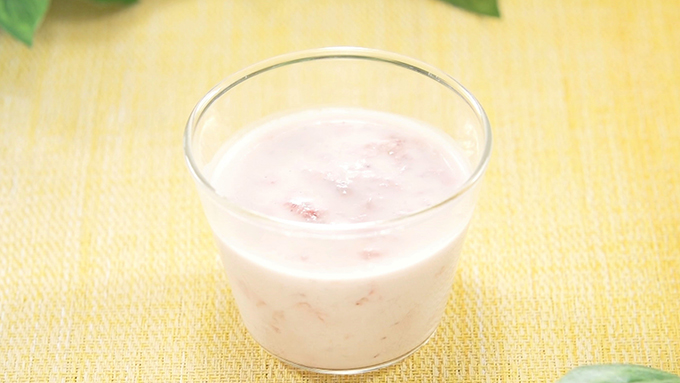 - 加熱したプリン液を、潰したイチゴが入ったボウルに加えて混ぜ合わせる。