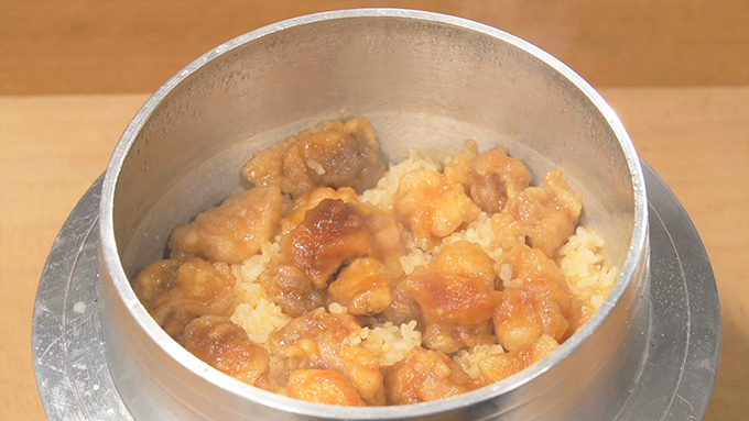 - 炊飯器の釜に浸水して水気を切った米、水、塩を入れて混ぜ、ヤンニョムチキン、氷を入れて炊く。