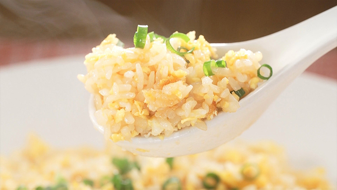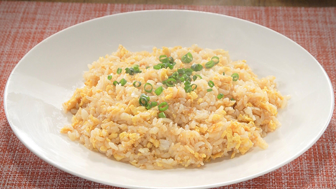 - 中華鍋でバターを熱し、溶き卵、ごはんを入れて炒め、