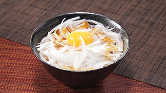 - ごはんの上にかつお節、新玉ねぎ、卵黄の順でのせ、しょう油を回しかける。