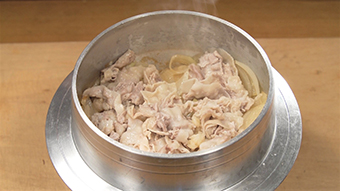 - かつおダシを煮立たせ、新玉ねぎを入れて中火で軽く煮る。