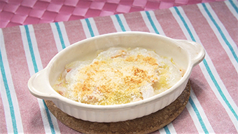 - 耐熱皿に移してパン粉とパルメザンチーズをかけ、200℃のトースターで約3分、薄く焦げ目がつくまで焼く。