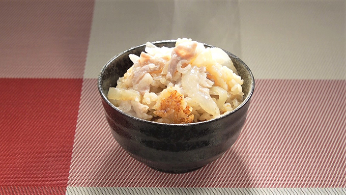 - 炊飯器の釜に浸水して水気を切った米と水、しょうが、ニンニク、しょう油、砂糖を入れて軽く混ぜ、玉ねぎ、豚肉、氷を入れて炊く。