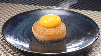フライパンに残った合わせ調味料をかけて卵黄をのせる。