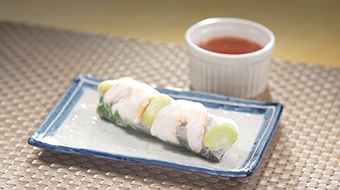 奥の方にそら豆とエビを交互にのせる。 - 両端を折り込みながら手前から巻く。