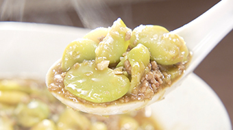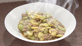 肉の色が変わったら甜麺醤、豆板醤を加えてさらに炒める。 - 全体が馴染んだら砂糖、しょう油、酒、鶏がらスープ、そら豆を入れ、軽く煮込む。