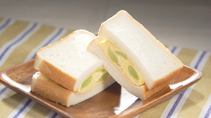3回繰り返して厚焼き玉子を作る。 - 食パンにバターとからしを塗り、ハムと厚焼き玉子をのせてマヨネーズをかけ、もう一枚のパンで挟む。