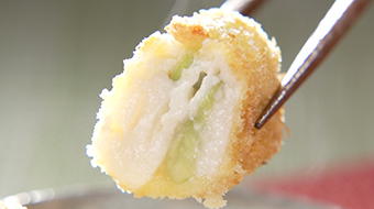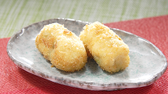 - 4等分にして俵型に成形し、小麦粉・溶き卵・パン粉の順につけ、170℃の油で2分揚げる。