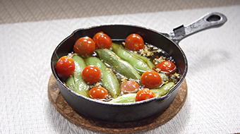 - スキレットにそら豆、にんにく、唐辛子、塩、コショウ、オリーブオイルを入れて約5分中火にかける。