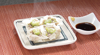 - 玉ねぎ、 エリンギ、そら豆を加えてさらに混ぜ、皮で包み、飾り用のそら豆を一粒ずつ上にのせる。