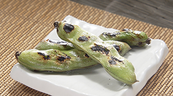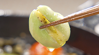 - そら豆は3分塩茹でして、薄皮を剝く。