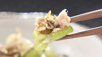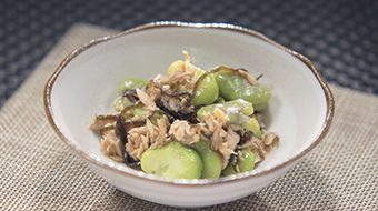 - ボウルにそら豆と塩昆布、ツナ缶を油ごと入れて混ぜ合わせる。