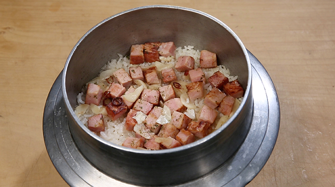 - 炊飯器の釜に浸水して水気を切った米とコンソメスープ、塩、ハーブソルト、おろしにんにく、アンチョビソースを入れて混ぜ、炒めた具材と氷を入れて炊く。