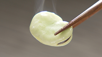 - そら豆は5分程やわらかめに茹でて薄皮を剥き、すり鉢ですり潰す。