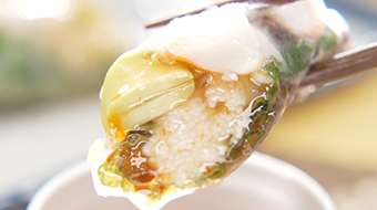 そうめんは茹でて水洗いし、4等分に分けておく。 - ライスペーパーを水で戻し、サニーレタス、大葉、そうめんを手前に、