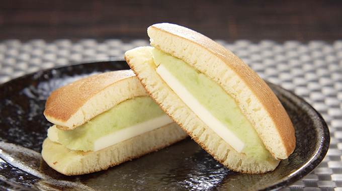 表面に穴が空いてきたら返し、さっと乾かす程度に焼き、バットにとりだしておく。 - 熱を取ったどら焼きの皮に、ずんだ餡とバターを挟む。