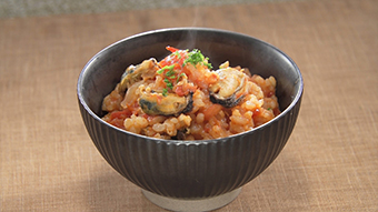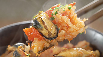 - 炊飯器の釜に浸水して水気を切った米とチリマッスルを汁ごと入れ、氷を加えて炊く。