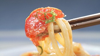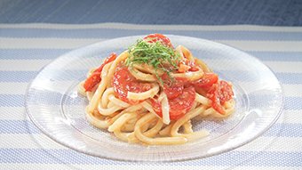 - うどんをボウルに入れてよく絡め、皿に盛る。