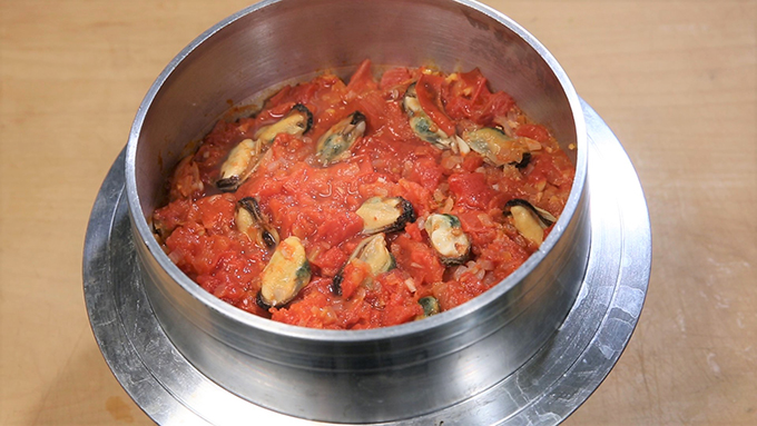- 玉ねぎがしんなりしたらトマト缶と切ったトマト、白ワイン、ムール貝を凍ったまま加えて5分煮込み、ムール貝の殻を取り出しておく。