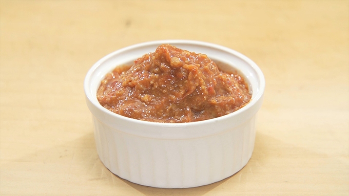 - ボウルにトマト味噌、トマト、おろししょうが、ゴマ油を入れて混ぜる。