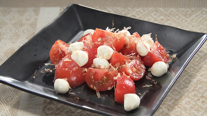 - 4等分に切ったトマトとモッツァレラチーズを盛り付け、オリーブオイルとかつお節をかける。
