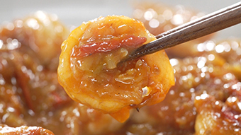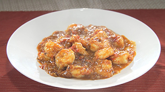 - トマトがソース状になったら、酒、砂糖、鶏がらスープの素、トマト味噌を加えて中火でさらに炒め、エビを戻し全体に絡める。