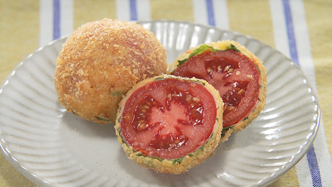 - 小麦粉、溶き卵、パン粉を順につけ、180℃の油で約1分、薄いきつね色になるくらいまで揚げる。